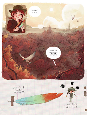 Cici's Journal: The Adventures of a Writer-in-Training is a middle grade graphic novel by Joris Chamblain with illustrations by Aurélie Neyret. The reader follows a little girl named Cici (obviously) who has designs to be a detective and writer hence the writing of her journal (the book flip flops between narrative style and journal style) which is chock full of her observational notes. She lives alone with her mother who she has a strained relationship with (and they haven't even hit the troubled teen years!). Next door is an older woman who is an acclaimed mystery writer and the motivator of Cici's interests. The plot contains solvable (and believable) mysteries for a child detective/writer and are full of imaginative characters. [A/N: The book is divided into sections with discrete (somewhat overlapping) mysteries.] Chamberlain explores but ultimately doesn't solve the mystery of the relationship between the mother and daughter (series teaser?). There's no explanation given (or mention of) the father's absence or why Cici has such a reticence to sharing or even experiencing her feelings. The more I dwell on it the more complex I realize this story line actually is which I think is great in a middle grade novel.